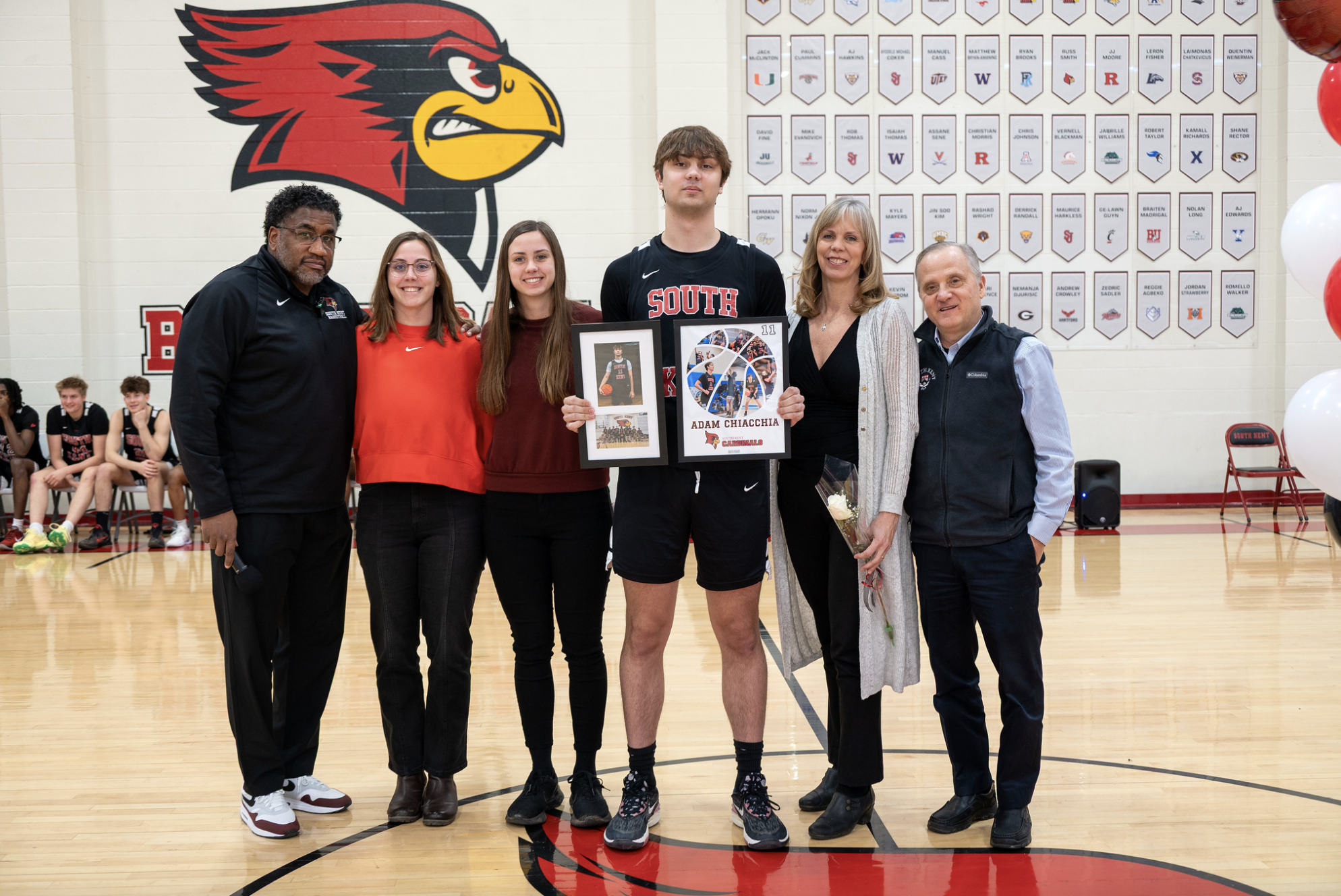 The gym was packed with students, families, and staff, all coming together to cheer on our graduating players. The celebration included custom posters, framed photo collages, and a special on-court ceremony, where each senior had the opportunity to present flowers to their parents or guardians as a token of appreciation. The event was decorated with balloon bouquets and a team banner, and attendees enjoyed special cupcakes and cookies to mark the occasion.