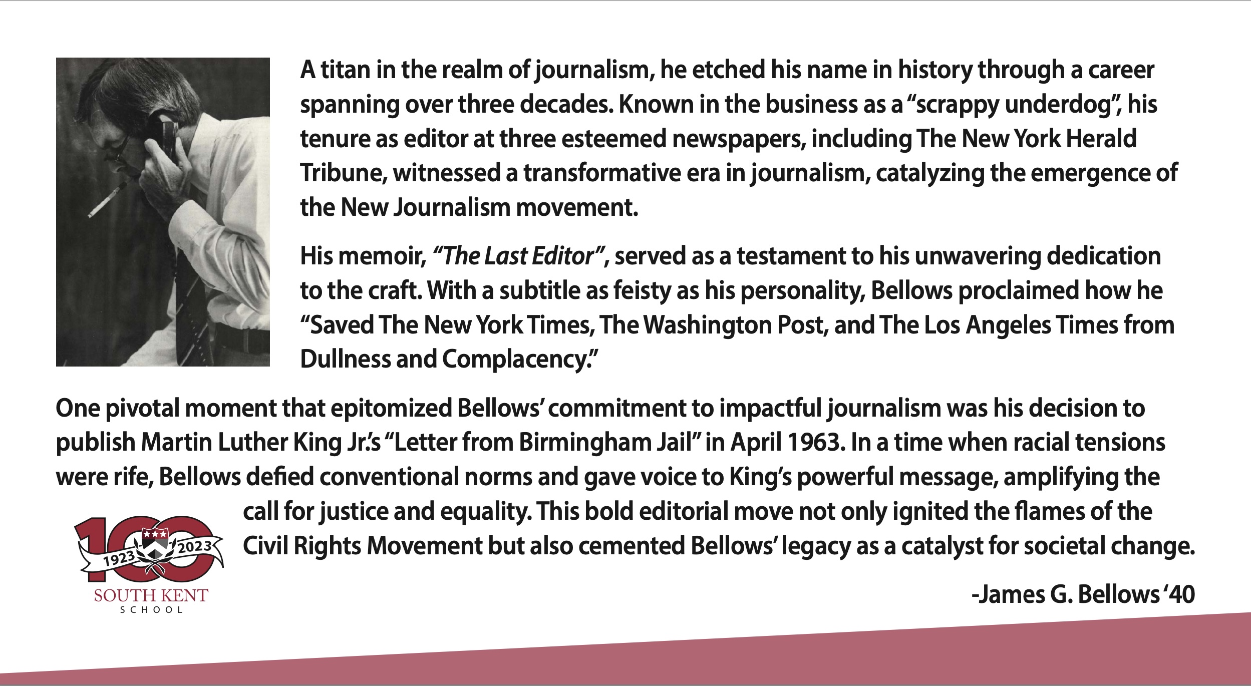 James G. Bellows ’40 https://southkentschool.org/alumni/notable-alumni/james-g-bellows-40/ Fri, 26 Jul 2024 12:11:55 +0000 https://southkentschool.org/?p=11208   A titan in the realm of journalism, he etched his name in history through a career spanning over three decades. Known in the business as a “scrappy underdog”, his tenure as editor at three esteemed newspapers, including The New York Herald Tribune, witnessed a transformative era in journalism, catalyzing the emergence of the New ... Read more