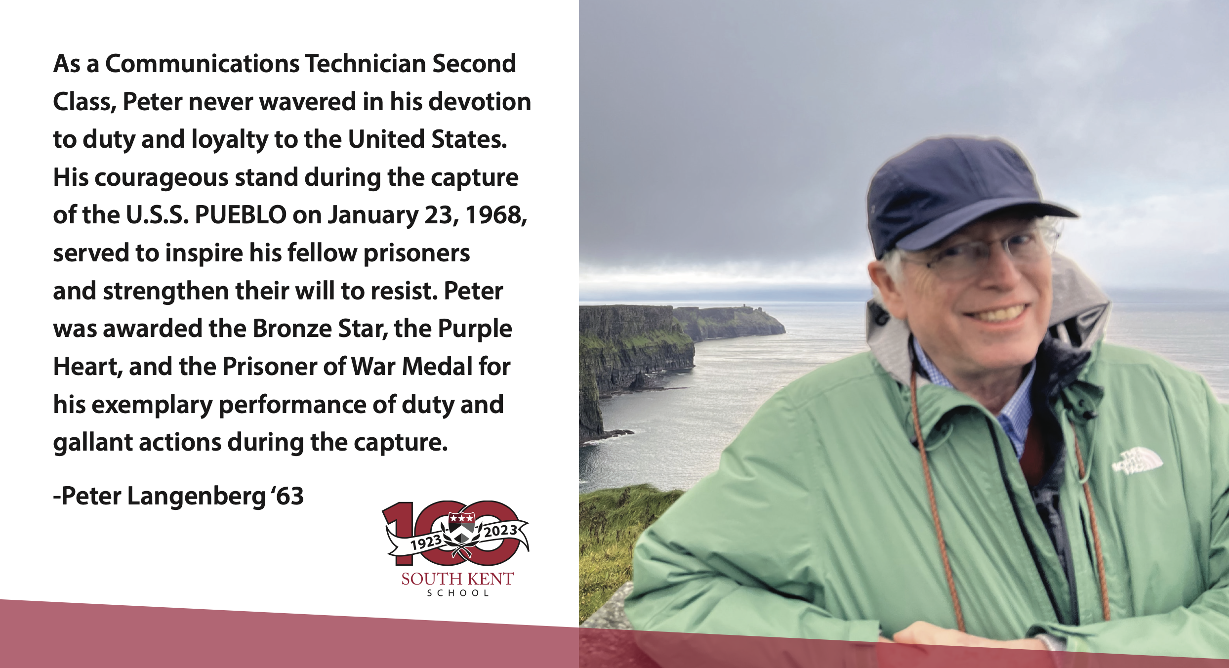 Peter Langenberg ’63 https://southkentschool.org/alumni/notable-alumni/peter-langenberg-63/ Tue, 23 Jul 2024 18:11:18 +0000 https://southkentschool.org/?p=11377 As a Communications Technician Second Class, Peter never wavered in his devotion to duty and loyalty to the United States. His courageous stand during the capture of the U.S.S. PUEBLO on January 23, 1968, served to inspire his fellow prisoners and strengthen their will to resist. Peter was awarded the Bronze Star, the Purple Heart, ... Read more