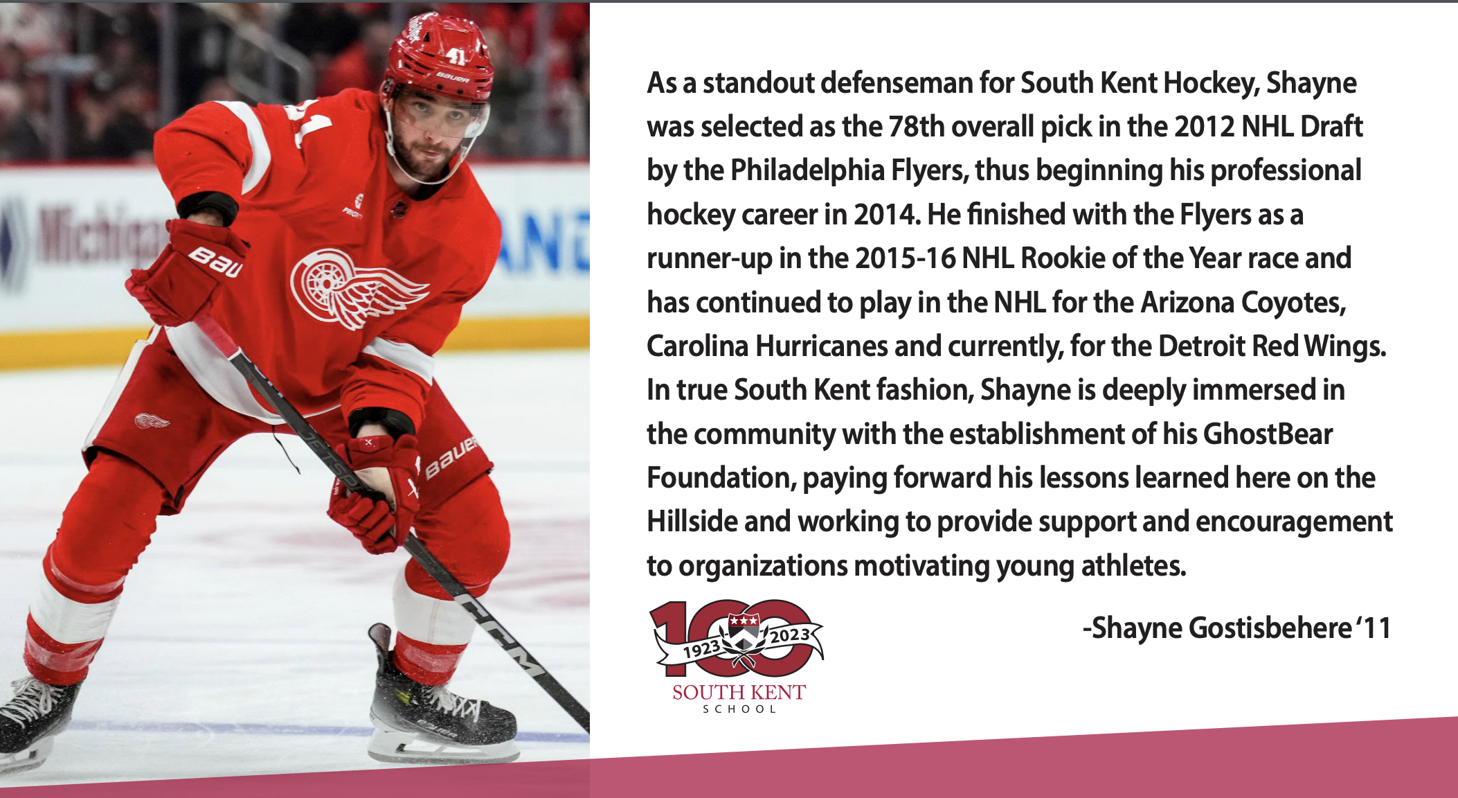 As a standout defenseman for South Kent Hockey, Shayne was selected as the 78th overall pick in the 2012 NHL Draft by the Philadelphia Flyers, thus beginning his professional hockey career in 2014. He finished with the Flyers as a runner-up in the 2015-16 NHL Rookie of the Year race and has continued to play in the NHL for the Arizona Coyotes, Carolina Hurricanes and currently, for the Detroit Red Wings. In true South Kent fashion, Shayne is deeply immersed in the community with the establishment of his GhostBear Foundation, paying forward his lessons learned here on the Hillside and working to provide support and encouragement to organizations motivating young athletes.